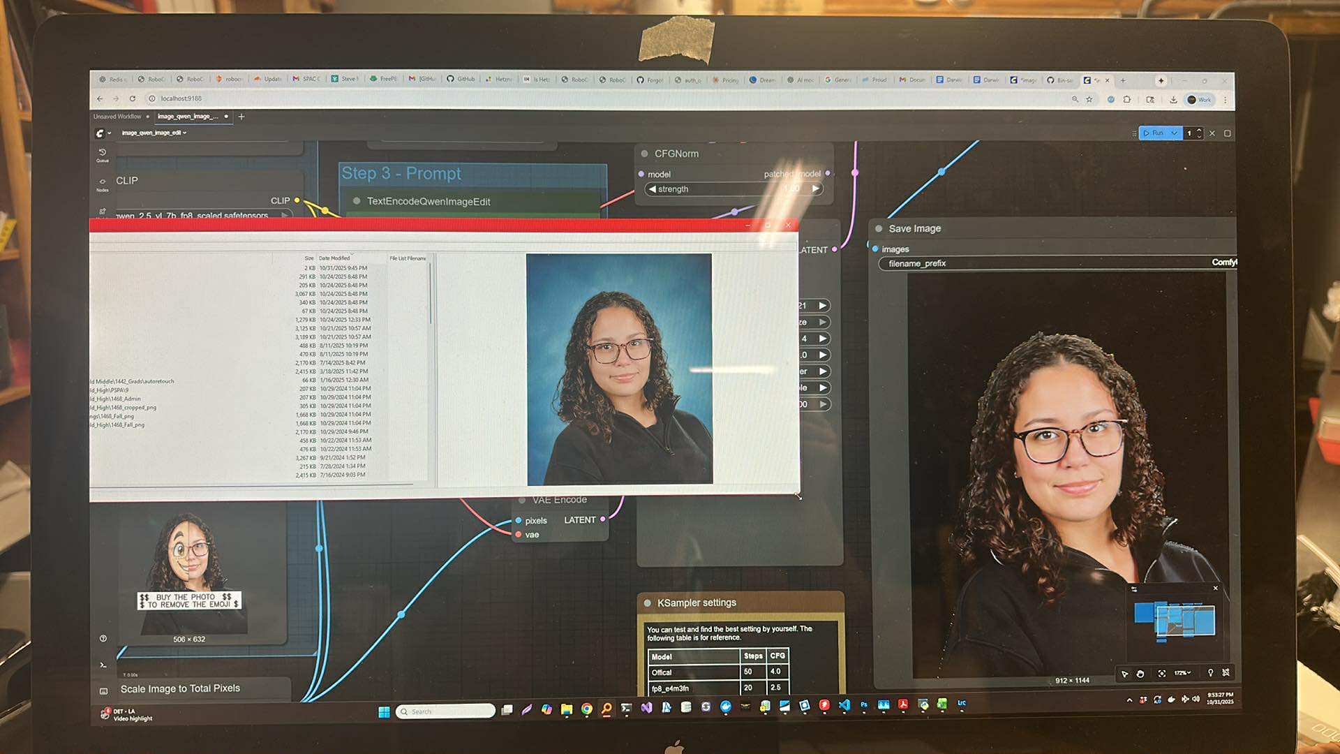 Bottom left is my watermarked sytist photo used as input image into the Ai model, top center is print production photo and right bottom is what the ai model output, and it was capable of reconstructing the water marked photo. I’ve tried batches of 100s images and it reconstructs the face with 80% accuracy.