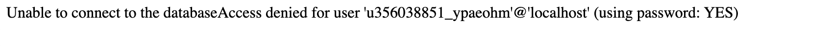 Either your user u356038851_db has no read/write access or your mysql db is inaccessible using the localhost as a host. Or your u356038851_db has wrong password in your sytist config