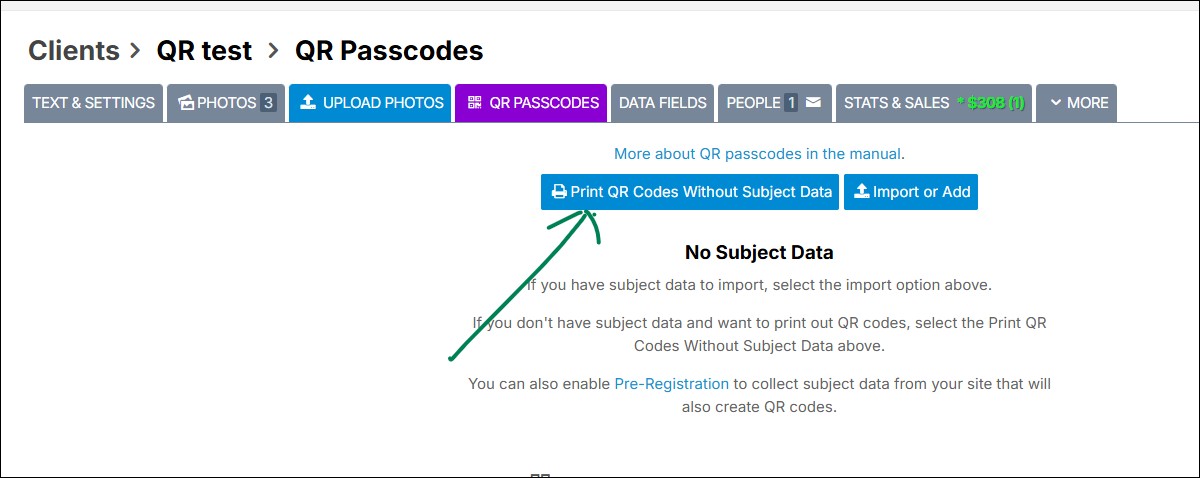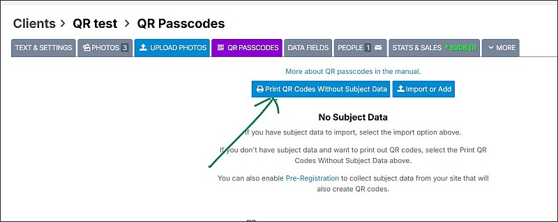 Unless I have misunderstood, it's not possible to print photos with QR codes unless you have already uploaded subject data?