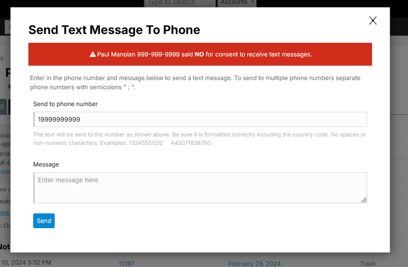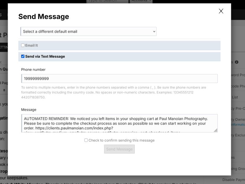 When I choose the "email information" option from a client gallery and change the message to be sent from the dropdown, I noticed that the client's consent to NOT receive text messages is not being honored. It will send an SMS message from this page even if they "Did NOT give consent for text messaging." It is not popping up the red warning that they selected NO for text message consent.