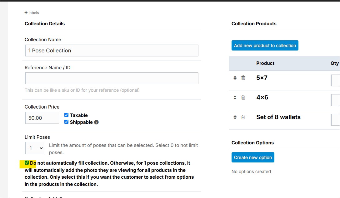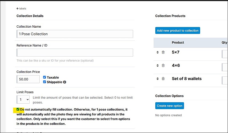 Check the option "Do not automatically fill collection. Otherwise, for 1 pose collections, it will automatically add the photo they are viewing for all products in the collection. Only select this if you want the customer to select from options in the products in the collection."