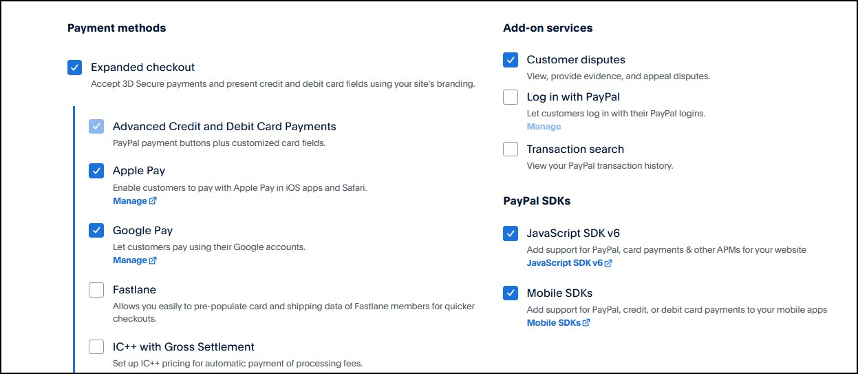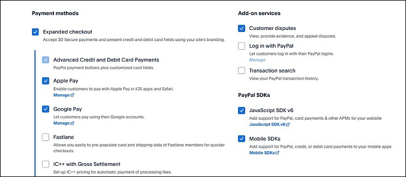 Go to API Credentials in the PayPal Developer section and scroll down to Features like in the attached screenshot and make sure those are checked.