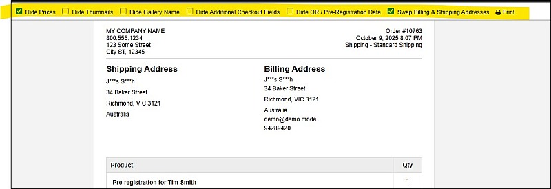 - Added the for print orders / packing slips: Hide Prices, Swap Billing & Shipping Addresses, Hide Thumbnails, Hide Gallery Name, Hide Additional Checkout Fields, Hide QR / Pre-Registration Data & a Print button. Option when viewing a print order / packing slip and the options you choose will be remembered.