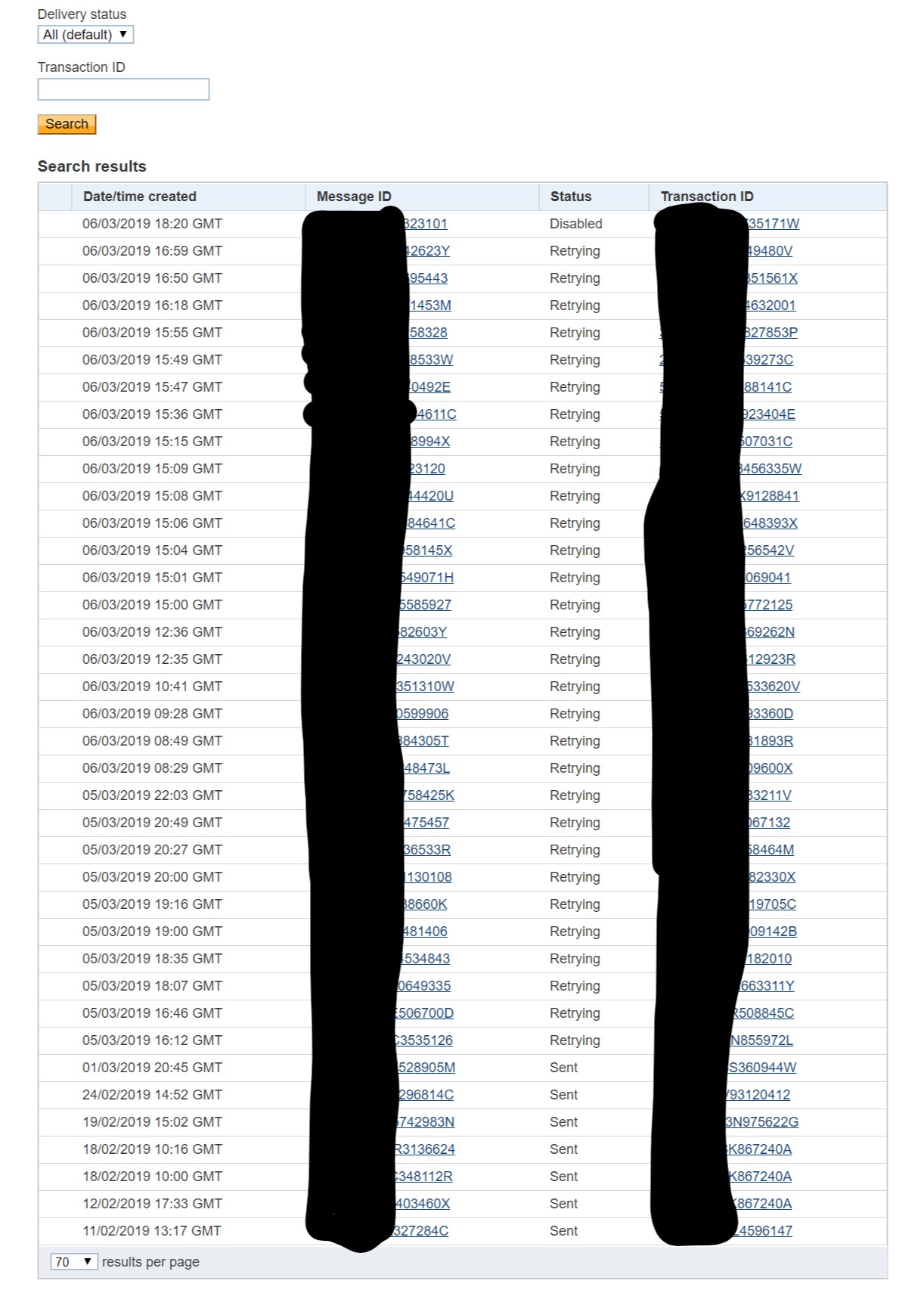 I'm at a loss... I have disabled IPN and now the latest entry to my IPN history just says status 'disabled' then a load from the last 2 days that say 'Retrying' then all the rest say 'Sent'